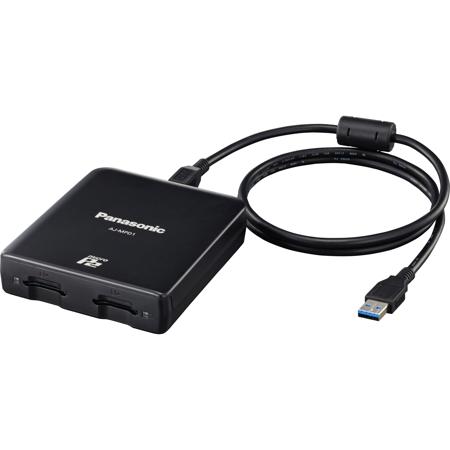 The Panasonic AJ-MPD1G MicroP2 Drive USB 3.0 Card Reader supports Panasonic's MicroP2 card format. microP2 cards are the same size as SD cards, but they feature RAID technology, increased bending and twisting strength over SD cards and an end of life notification function. The microP2 reader allows you to transfer video files from Panasonic's microP2 data cards to a computer using a USB 3.0 or USB 2.0 port. The unit is powered by the USB connection and it features two data card slots.