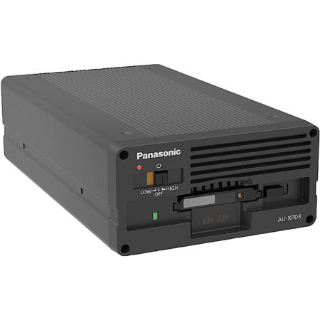 The AU-XPD3 Memory Card Drive "expressP2 drive" uses the Thunderbolt 3 interface to achieve high speed data transfer. The expressP2 card B series are developed as recording media for the Panasonic VariCam series camera, due to record 4K/highframe-rate video. The AU-XPD3 takes full advantage of the high data transfer performance (maximum 10 Gbps) of this media, thus achieving about four times faster transfer speed than its predecessor, the AU-XPD1/USB 3.0. When two AU-XPD3 units are daisy-chained, data can be transferred at an increased speed of 17.6 Gbps. The card slot accommodates an expressP2 card, P2 card or microP2 card (adaptor required). The AU-XPD3 contributes to speedier 4K/high-frame-rate video production workflows using VariCam.