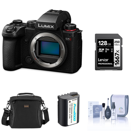 The Lumix S5 II bundle includes the camera itself, a Panasonic DMW-BLK22 battery, a 128GB memory card, and a shoulder bag for convenient transportation.