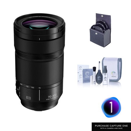 The LUMIX S 70-300mm f/4.5-5.6 Lens bundle includes a Capture One 23 Pro Key Card, a 77mm filter kit, and a cleaning kit.