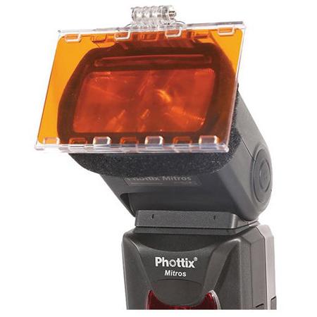 Using gels with hot shoe flashes can be challenging. How can you attach them? With Velcro tabs or gaffer tape or some other inelegant contraption. Enter the Phottix Hot Shoe Gel Set. This set includes a plastic gel mounting bracket that easily attached to most hot shoe flash heads using a Velcro strip. Easy use any of the 30 included gels with hot shoe flashes. The black/silver attachment can be used a barndoor/flag or a bounce card.