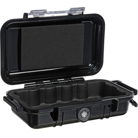 The Pelican 1015 Micro Case (Black with Black liner) is a water-resistant, crushproof and dust proof Copolymer polycarbonate case with a rubber liner for extra protection that doubles as an o-ring seal. It is designed to carry small portable electronics such as, cameras and cell phones. It can be carried by a removable active sport carabiner that secures the case to a backpack or belt loop.