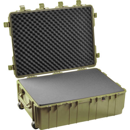 With the 1730 Transport Case with Foam, you can secure your valuable equipment in a robust, Olive Drab Green case that boasts a 10" bottom depth. This case is designed with an open cell core and solid wall design, making it both strong and lightweight. It features easy-open double throw latches for quick access and extra deep stackable cleats for convenient storage.