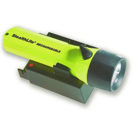 The rechargeable version of the StealthLite 2400 Flashlight. The 2450 provides a consistently bright Xenon beam after every charge. It is submersible and corrosion proof. The charger base unit can be installed at home or work using the 110V transformer. Or in a vehicle through direct wiring or 12V plug-in. It comes with a long-life rechargeable NiMH battery pack, but 4 AA alkaline cells can also be used.