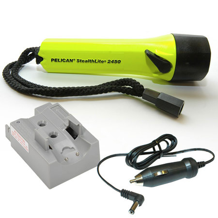 The rechargeable version of the Pelican Stealthlite 2450 Flashlight. The Pelican Stealthlite 2450 Flashlight provides a consistently bright Xenon beam after every charge. The Pelican Stealthlite 2450 Flashlight is submersible and corrosion-proof. This Pelican Stealthlite 2450 Flashlight comes with a long-life rechargeable NiMH battery pack, but 4 AA alkaline cells can also be used. This package is only the flashlight and battery. The charging accessories will need to be purchased separately. The charger base unit can be installed at home or work using the 110V transformer or in a vehicle through direct wiring or 12V plug-in.