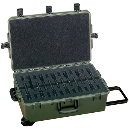 Transport and store up to 12 pistols securely with this Pelican Wheeled Gun Case. Built from tough, watertight resin, it features a precut foam interior and a convoluted lid liner that cradle your firearms and keep them firmly in place during travel. An O-ring seal blocks out dust and moisture, while the Vortex pressure-relief valve balances internal air pressure so the case opens easily after altitude or temperature changes.