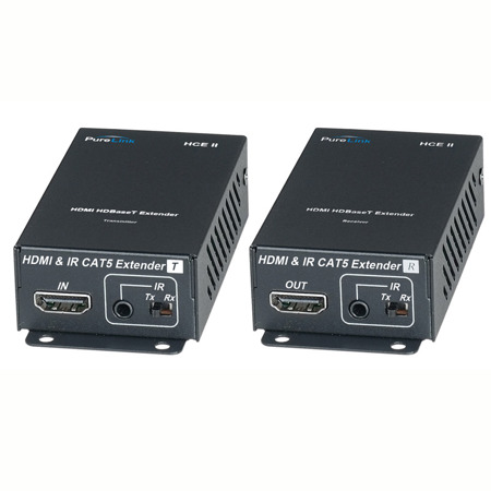The PureLink HCE II is a transmitter and receiver set for long distance extension of HDMI video and embedded audio with bi-directional control signal (IR) over single CAT 5/6/7- type cable. It is designed on HDBaseT technology which allows full 3D support with up to 230' (70m) at 1080P at 60Hz and 130' (40m) at 4K2K (UHD) resolution.