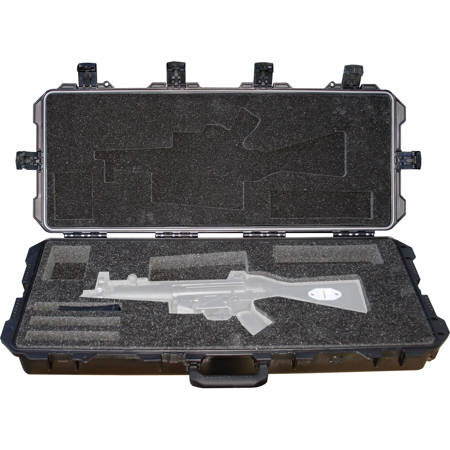 Injection molded Pelican Storm Case with HPX resin plastic body case with polyethylene foam cushion designed to fit (1) MP5 (with or without suppressor). Unique foam cavities easily accommodates dual magazines, shoulder harness, slings and cleaning kits.