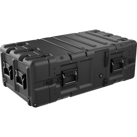 Pelican SUPER-V-5U-30 is a rugged 30" deep, 5U V-Series rack mount transport case built from roto-molded polyethylene with a steel 19" rack frame and watertight seal, designed to protect and transport rack equipment with wheels and durable handles.