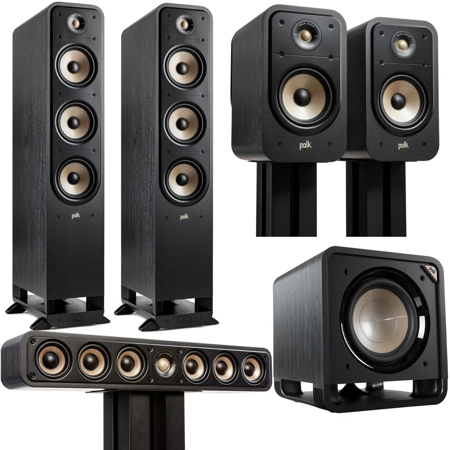 Explore the pinnacle of home audio performance with the Signature Elite 5.1 Home Theater Pack, featuring the ES60 Floorstanding Speakers, HTS 12 Subwoofer, ES35 Slim Center Channel, and ES20 Bookshelf Speakers. This meticulously engineered system, designed in the USA, is the embodiment of Polk Audio's commitment to high-quality sound, offering a powerful and immersive Hi-Res Audio experience for movies, TV, music, and games.