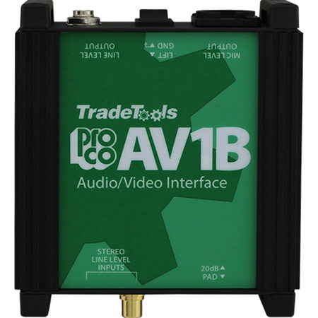 The Pro Co Sound AV1B allows the line-level outputs of audio and video playback devices, etc., to be connected to microphone inputs of house or portable P.A. systems for programs in school auditoriums, lecture halls, civic meetings and corporate board rooms. The AV1B provides audio interfacing and isolation with wide response and low distortion.