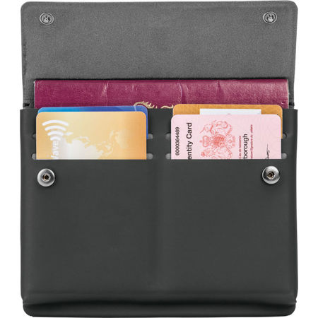 This streamlined RFIDsafe TEC passport wallet has a passport-holding compartment and four easy access card slots in a a ultra lightweight, heat-welded design with a soft microfiber lining.