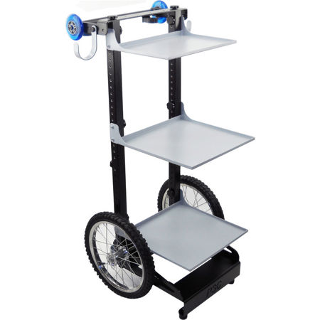 The PSC Euro Cart XL is 8 inches higher than the standard size Euro Cart allowing room for additional shelves and drawers. In addition, the "XL" version comes with a deeper handle allowing more clearance when used with deep rackmount accessories such as the Lectrosonics Venue. This elongated handle also comes with small blue wheels allowing the entire cart to be rolled into low SUVs on its back. Just like the standard Euro Cart, the PSC Euro Cart XL comes standard with two large shelves, one small shelf, two boom pole holders, two cable hooks and 16-inch bicycle style pneumatic wheels. Options include the front caster kit, rackmount brackets, additional cable hooks, etc.