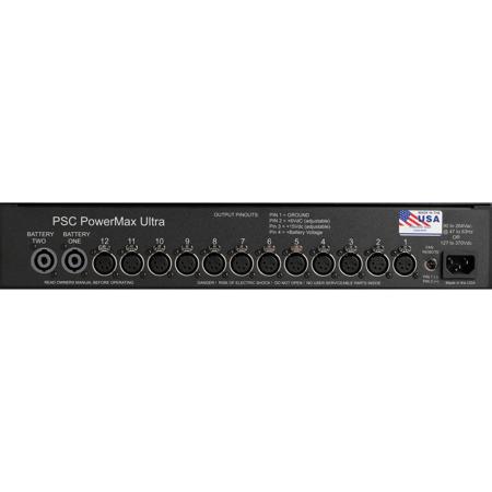 The PSC PowerMax Ultra Power Distribution Platform with Built In 10 Amp Li-fe Battery is designed to provide clean and quiet power to your mixer, wireless receivers, portable digital recorders, small video monitors and other equipment. It supplies power from either an AC source or up to two sealed lead acid batteries. It can output 12VDC at up to 30 amps and 15 to 18VDC. In addition to being able to be powered by optional, external batteries, the PowerMax Ultra has two on-board battery chargers that operate from 100VAC to 240VAC. The unit features 12 4-pin XLR outputs that each have dedicated EMI/RFI output filters for clean power.