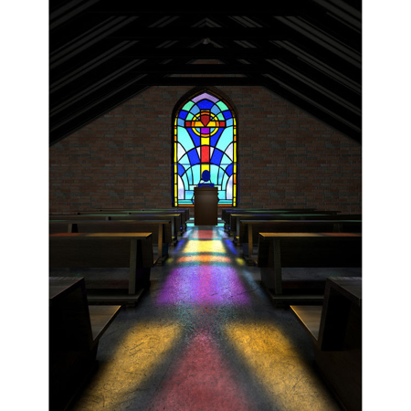 This is a perfect intimate background for delivering impactful messages. This stained glass church includes beautiful reflections between traditional pews.