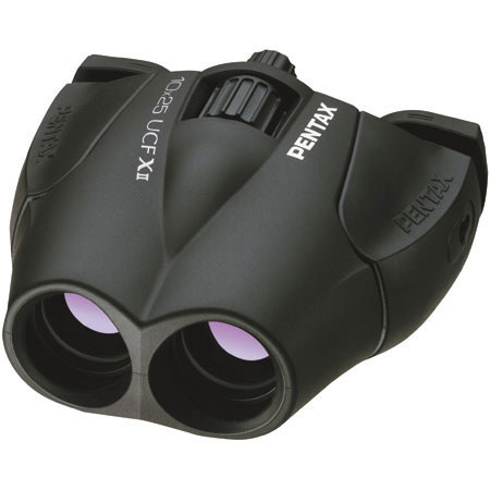 The UCF X II-series models feature the PENTAX-original dual-axis eye-distance adjustment system to ensure precise alignment of the lens barrels. Coupled with large 25mm objective lenses, high-refraction BaK4 glass prisms, multi-coated optical elements and aspherical eyepiece lens elements, they deliver high-quality images even under poor viewing conditions. The compact, lightweight binocular bodies are protected against dust and shock by a full-bodyrubber housing. Other user-friendly features include a long 15-millimeter eye relief, a short minimum focusing distance of 1.9 meters/6.2 feet, extendible eyepiece rings, a fully retractable pop-up diopter adjuster, and a tripod socket.
