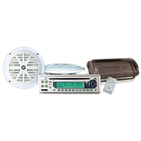 The Pyle PLCD11MRKT Waterproof Marine CD/MP3 Player Receiver includes a head unit, two black waterproof 5.25" speakers and a splashproof tinted cover for the head unit. The head unit is capable of tuning AM/FM, playing audio and MP3 CDs and has an auxiliary input to plug in another device like an iPod or MP3 player. It's rated at 4 x 25 W, so each speaker has plenty of independent power. And it comes with everything you've come to expect from a modern head unit: 3-beam laser tracking, anti-skip mechanism, loudness settings and a 24-station memory.