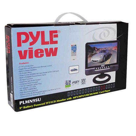 The Pyle PLMN9SU 9" Battery Powered TFT/LCD Monitor works great in or out of your vehicle, thanks to the built-in two hour rechargeable battery. Connect a DVD player, video game system, rear view camera, or any other device over the AV input port. This monitor can also play audio and video files from SD, MMC, MS and mini-USB inputs. Built-in stereo speakers allow you to watch your favorite videos without headphones, or go private by plugging in to the standard headphone jack. A super-thin wireless remote control is included to control playback and adjust monitor settings remotely.