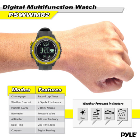 Discover, travel, exercise and explore in a whole new way with the Pyle PSWWM82 Digital Multifunction Active Sports Watch (Yellow). This futuristic and technologically advanced wrist watch will act as your very own data center and meteorologist - all within arm's reach. Versatile capability and next-generation technology takes this watch far beyond your typical wrist watch. Features and modes include temperature, barometer, altimeter, weather prediction, dual-time function, chronograph, alarm and more.