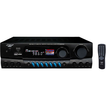 Get the music flowing with this Pyle PT560AU 300 watts digital AM/FM stereo receiver with a USB port for digital music playback. Store up to 50 presets, power two sets of speakers thanks to the A/B switch and plug in a USB drive with MP3s to listen to your favorite digital music. Inputs include 3 stereo RCA inputs on the back, plus two 1/4" mic-jacks on the front - so it's perfect for singing along to your favorite music. A wireless remote control gives you full access to the receiver's settings from your couch. Runs on both 110 and 220 V.