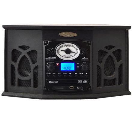 Get that classic jukebox look updated with modern technology with the Pyle PTCDS7UI Retro Vintage Turntable System (Black). This player does it all - 3-speed vinyl, CD, digital MP3 playback with USB and SD cards, AM/FM radio and even a cassette player. This jukebox will handle media from almost every generation of the 20th century. Plus, you can even convert your old vinyl and cassettes to digital MP3 files using this player. And with a 3.5 mm auxiliary input jack, you can also connect your iPod, iPhone, iPad, Android cell phone, or virtually any other digital music player with a headphone jack.