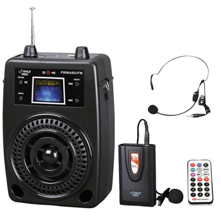 The Pyle PWMA80UFM is a 100-watt, rechargeable portable USB/SD-equipped PA with headset lavalier microphone. The small, super-powerful voice amplifier is perfect for teachers, coaches, tour guides and presenters - you can be heard up to half a mile away. The built-in rechargeable batteries last up to 8 hours. Headset microphone keeps your hands free. Listen to your digital music files via the USB port or SD card slot, or hook up any digital music player using the auxiliary input. Connect the PWMA80UFM to a more powerful speaker using the 3.5 mm output jack.