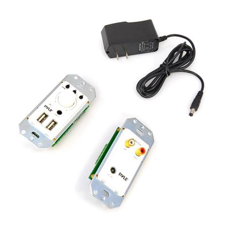Wall plate features include rotary volume control knob with touch button controls, AUX (3.5mm) audio input for connecting external devices, RCA (L/R) outputs for amplified system connection and dual USB device charging ports. The audio receiver includes a power supply adapter along with integrated RJ-45/Network Ethernet jacks for optional system connection. Enjoy versatile and wireless audio control with the Pyle PWPBT67 Bluetooth In-Wall Audio Control System.