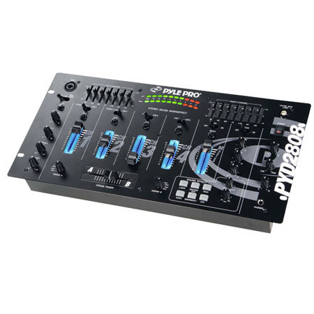 The Pyle PYD2808 4-channel rack-mountable professional mixer is an essential piece of DJ/audio equipment. There are 8 line inputs, two of which can be used for phono (turntable) input and 2 mic inputs, including one combo balanced XLR/1/4" input. The mic channels have discrete 3-band EQ and a talkover switch, while each of the 4 stereo channels has its own gain control. Includes 8 sound effects that can be modulated by speed and volume, including gunshot, laser, tron blast, rim shot, siren, emergency, UFO and cymbal. Use the built-in echo delay/repeat for a cool effect.