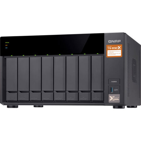 The powerful 8-bay, quad-core TS-832X includes two 10GbE SFP+ ports to fully support 10GbE high-speed networks at a budget price with maximized ROI. It is also an ARM-based NAS that supports Qtier technology for efficient auto-tiered storage. The PCIe slots extend greater application potential, for example, by installing QNAP's new PCIe wireless network card QWA-AC2600 the TS-832X is transformed into a convenient wireless base station that allows devices to directly connect to the NAS for easy access to its services and Internet connection.