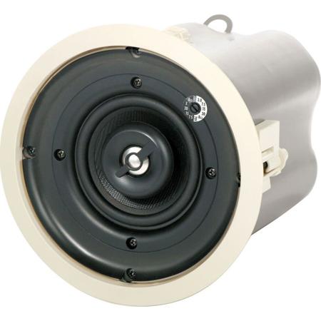 The QSC AcousticDesign AD-C42T 4" 2-Way White Ceiling Speaker (Pair) is rated for 40 Watts continuous power handling and able to take up to 160 Watt peaks. The 4 " woofer is equipped with a polypropylene cone for protection in humid environments. The driver features a synthetic rubber surround and in its sealed enclosure is optimized to deliver useable low frequency extension below 70 Hz. The high frequency device is a co-axial, post mounted 0.75 " dome tweeter with a titanium diaphragm and a cloth surround. The coaxial post is mounted slightly off center in relation to the low frequency driver in order to lessen the destructive interference often found with axisymmetric post mounted coaxial systems.