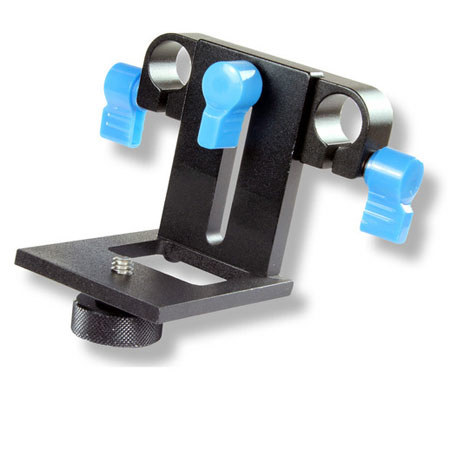 The Quantum OM42 Rail Mounting Bracket for Omicron Video Lights is an anodized aluminum L-type bracket made for Quantum Omicron 3 and Omicron 8 ring lights. It has a bottom 1/4"-20 knurled mounting knob and two 15mm rail mounts, each with a tightening knob.