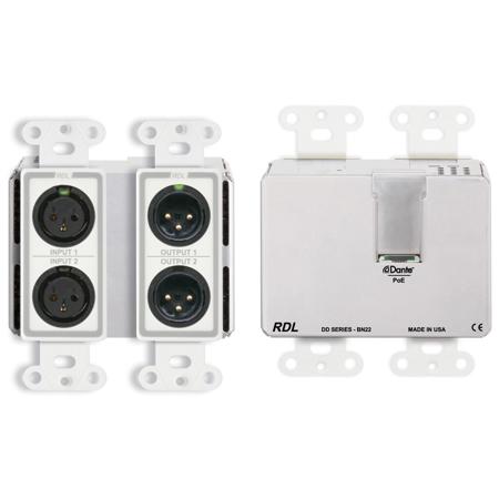 The DD-BN22 fits a standard US dual-gang electrical box or an RDL WB-2 back box for installations in thinner European or equivalent walls. The DD-BN22 is PoE powered and is available in multiple finishes with optional customized graphics. The two XLR inputs are each converted to a separate Dante network transmit channel. Three gain settings are switch-selectable for both the mic and line input ranges to match condenser or dynamic mic levels and standard line levels. Two Dante audio channels are converted to balanced line level on front-panel XLR jacks. Each output provides +4 dBu balanced for a network digital audio level of -20 dBFS.