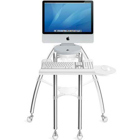 The Rain Design iGo Sitting for 21.5-23" iMac/Cinema Displays lets you work and play where you want. The iGo desk is designed to fully integrate with your iMac G5. The turntable lets you turn your iMac with a light push of a finger and connects to all the ports behind your iMac easily. The keyboard panel adjusts for height and depth for good ergonomics and is interchangeable to suit both left or right hand users.