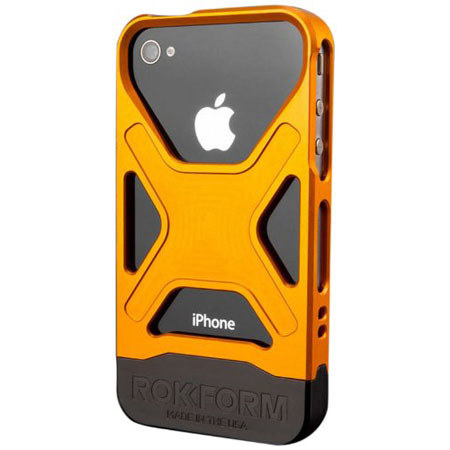 The Rokform Rokbed Fuzion Cover for iPhone 4/4S (Orange) is CNC machined from 6061 T-6 aircraft grade aluminum and injection molded polycarbonate. The polycarbonate lower portion quickly snaps in and out of the aluminum but fits snug enough for a safe and secure protective fit.