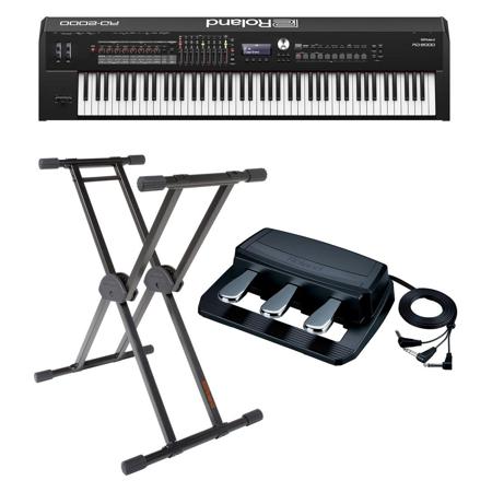 The RD-2000 bundle includes the Roland RPU-3 Pedal Unit with 3 separate 1/4' jacks and the KS-20X Double Brace Keyboard X-Stand. These accessories enhance the functionality and convenience of the digital stage piano.