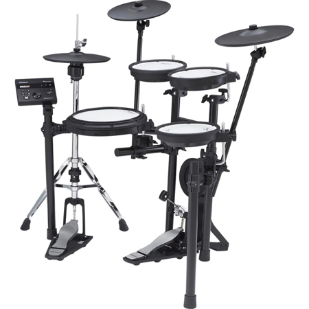 Back in 1997, Roland transformed the digital drum market with the debut of the world's first mesh drumheads. This unique dual-layer mesh design gives stick resistance and rebound worthy of a great acoustic drumhead, and the authenticity even extends to finer details like adjustable tension using a standard drum key. You'll only get that lifelike feel and sensing speed with a Roland mesh head. And it's not only the mesh heads that revolutionize the playing experience-the VH-10 hi-hat, CY-12C crash, and CY-13R ride shimmer and swing like your favorite acoustic cymbals too.
