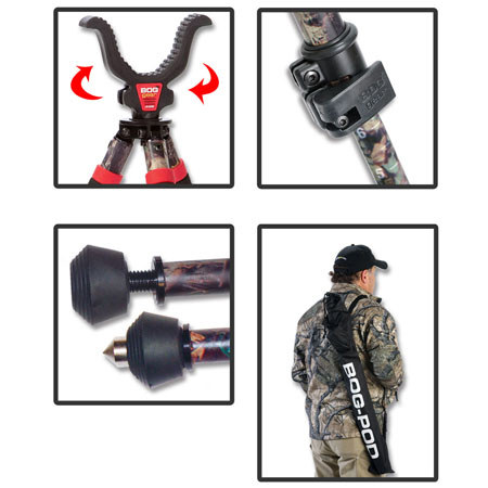 The BOGgear CLD2 Aluminum Bipod Shooting Stick is great for hunting, photography or hiking. Three-section telescoping, fully camouflaged aluminum legs with height markers for quick, exact adjustments. Leg stops prevent overextension. It can be used in sitting, kneeling or standing positions. It extends from 22" to 68".