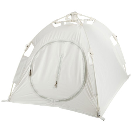 The Quick Pop-up Light Tent features a patented system that allows for instant setup. Simply pull the two strings and the tent is ready to use.
