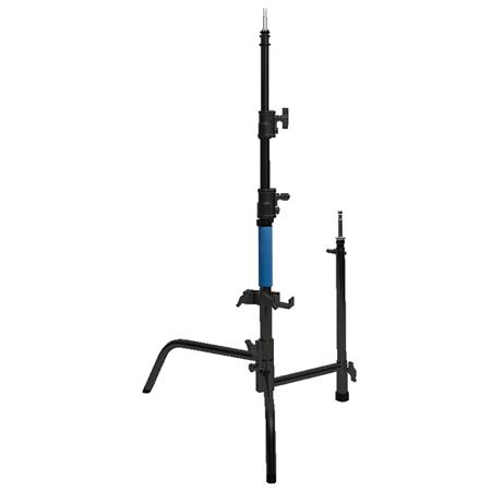 An extra included 20" (51cm) riser with junior to baby pin stores away onto the side of the main riser when not in use, and can be mounted into the leg's junior receiver for double action. Mount two lights or one light and a scrim onto both risers to get maximum use from one C-stand. Remove the junior to baby pin from the secondary riser and drop into the leg junior receiver for ultra-low positioning. Transfer the riser from the center to the leg junior receiver to move a light snugly into a corner. Adjust the riser through the foot of the leg to level the stand on stairs or uneven surfaces.