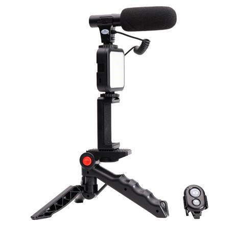 The portable and lightweight design of the Savage Mobile Vlogging Kit is perfect for the vlogger on-the-go! The included universal supercardioid, unidirectional, shotgun microphone will enhance your subject's voice while blocking out ambient noise. Great for noisy venues! Need to use on-the-go The tripod stand collapses to create a pistol grip stabilizer for reduced vibration when moving. Includes a Bluetooth wireless shutter release (for iPhone and Android) for selfies up to 30' (9.14m). Need to film at night Mount the 36-chip LED video light for extra illumination. Take the Savage Mobile Vlogging Kit with Microphone with you anywhere!