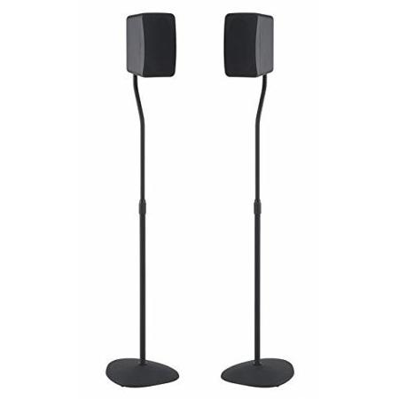 The SANUS VuePoint HTBS satellite speaker stand is the perfect addition to any home theater. The stand is height-adjustable, so satellite speakers up to 3.5 lbs. can be positioned 28 in to 38 in from the floor for a customized setup. It can be assembled in minutes using just a Phillips screwdriver. Each heavy-gauge steel pillar is offset for optimum sound and features an integrated wire channel for easy management. Rubber feet or carpet spikes can be attached to the stable cast iron base for superior vibration reduction. Includes top plate, L-shaped brackets and keyhole mount adapters to fit most small satellite speakers. This product is sold as a pair.