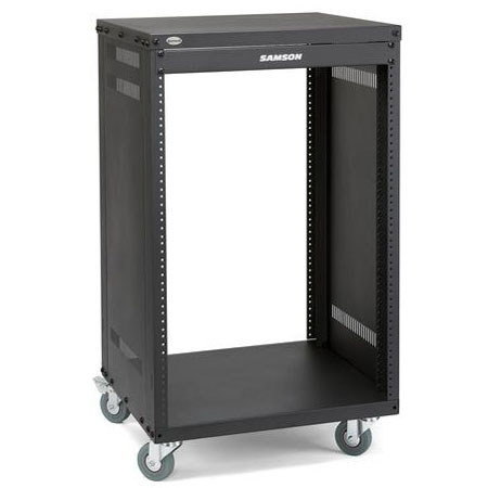 The Samson SRK16 16 Space Universal Rack Stand is designed to store and organize a wide range of 19" rack-mountable equipment, such as audio and video devices, servers, routers, switches, and other networking devices.