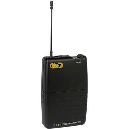 The Samson CT7 Beltpack Transmitter can be configured as a lavalier, headset, wind instrument and guitar system thanks to the popular locking P3 input connection. The Samson CT7 Beltpack Transmitter also features a three-segment battery indicator, separate power and audio on/off switches, adjustable AF level (audio gain) and 12 hours of battery life on a single 9-volt battery.