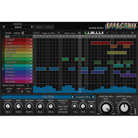 Effectrix is the perfect tool for sequenced sound manipulations. Tweak your beats, create new rhythms, reverse parts, stretch others, apply delaylines; even create melodies with atonal material. If you like, do it all at once! Have it your way with 14 Candy Effects of Sugar Bytes latest Bang Effectrix, each one providing its own step sequencer and two modulation-sequencers.
