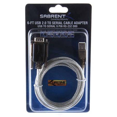 The Sabrent 6' USB 2.0 to Serial (9-Pin) DB-9 RS-232 Adapter Cable is the perfect solution for transferring data from a PDA or digital camera. The USB to DB9 provides a connection between an available USB port and the more traditional RS-232 serial port found on many devices. This adapter is designed for connections to cellular phones, PDAs, digital cameras, modems or ISDN terminal adapters through your USB port. Simply plug your device into the adapter and the adapter into your PC or Mac. COM ports and Baud rates can be modified to desired set up. Utilizes the FTDI chipset, plug and play, driverless installation.