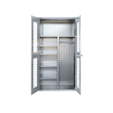 TGS 2500 weapon and gear storage cabinet holds up to six rifles or shot guns. Four adjustable half width shelves and 1 fixed full width shelf have a 400 lb. holding capacity each. Shelves hold additional gear and ammo for increased organization. Hanger bar provides storage option for clothing and body armor. The TGS 2500 is popular for units that store ammunition and high value gear with their weapons. These TGS cabinets are compatible with a wide variety of industry standard storage bins and trays that adjust on the louvered back panel.