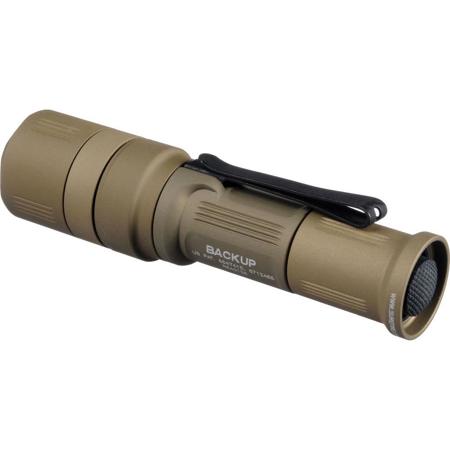 The SureFire EB1 Backup Dual-Output Flashlight (Shrouded Tailcap Switch, Desert Tan) is an extremely compact dual-output flashlight with a 200-lumen maximum output that can be used as a backup light for patrol officers or a duty light for plainclothes officers. It's also ideal for everyday-carry, self-defense, or outdoor applications. The EB1 features a virtually indestructible LED emitter and a precision Total Internal Reflection (TIR) lens, creating a beam with the optimum configuration for both reach and situational awareness.