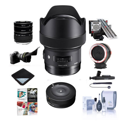 The bundle includes several accessories to enhance the lens's functionality and ease of use. These include a Flex Lens Shade, Auto Extension Tube Set, Calibration Aid, Wrap, Cleaning Kit, Tether, Cleaner, USB Dock, Case, and Software Kit.