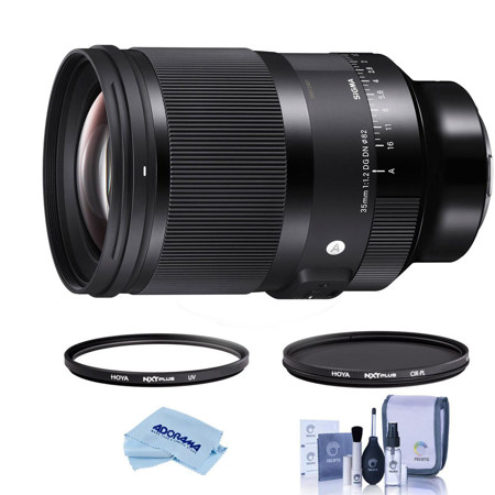The bundle includes the Sigma 35mm f/1.2 DG DN ART Lens, a Hoya NXT Plus 82mm UV+CPL Filter Kit, a cleaning kit, and a microfiber cloth.
