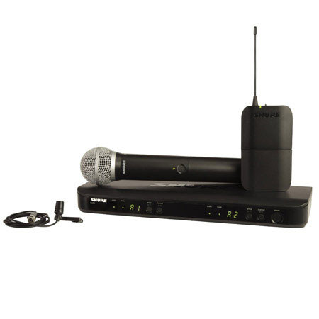 The Shure BLX1288/CVL Dual-Channel Combo Wireless System (J10:584-608MHz) includes a BLX88 dual-channel wireless receiver, a BLX1 bodypack transmitter, a CVL lavalier mic, a BLX2 handheld transmitter with a PG58 microphone and 4 AA batteries.